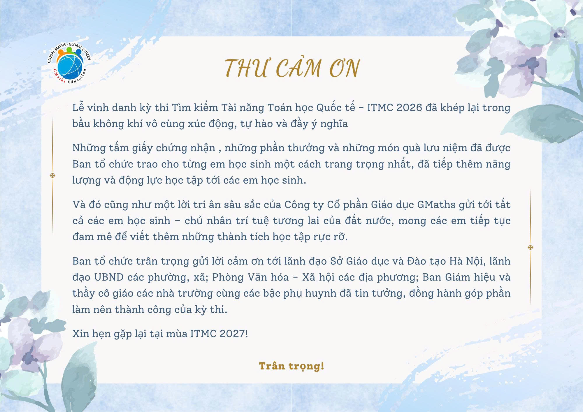 BTC ITMC Việt Nam trân trọng cảm ơn sự quan tâm, tạo điều kiện của Sở Giáo dục và Đào tạo Hà Nội, chính quyền địa phương và Phòng Văn hóa – Xã hội thuộc UBND các phường, sự hỗ trợ của các Nhà trường và sự đồng hành của PHHS! Chúc mừng các thí sinh đã hoàn thành thử thách tại Vòng Quốc gia (Vòng 1) – Sân chơi “Tìm kiếm Tài năng Toán học Quốc tế...